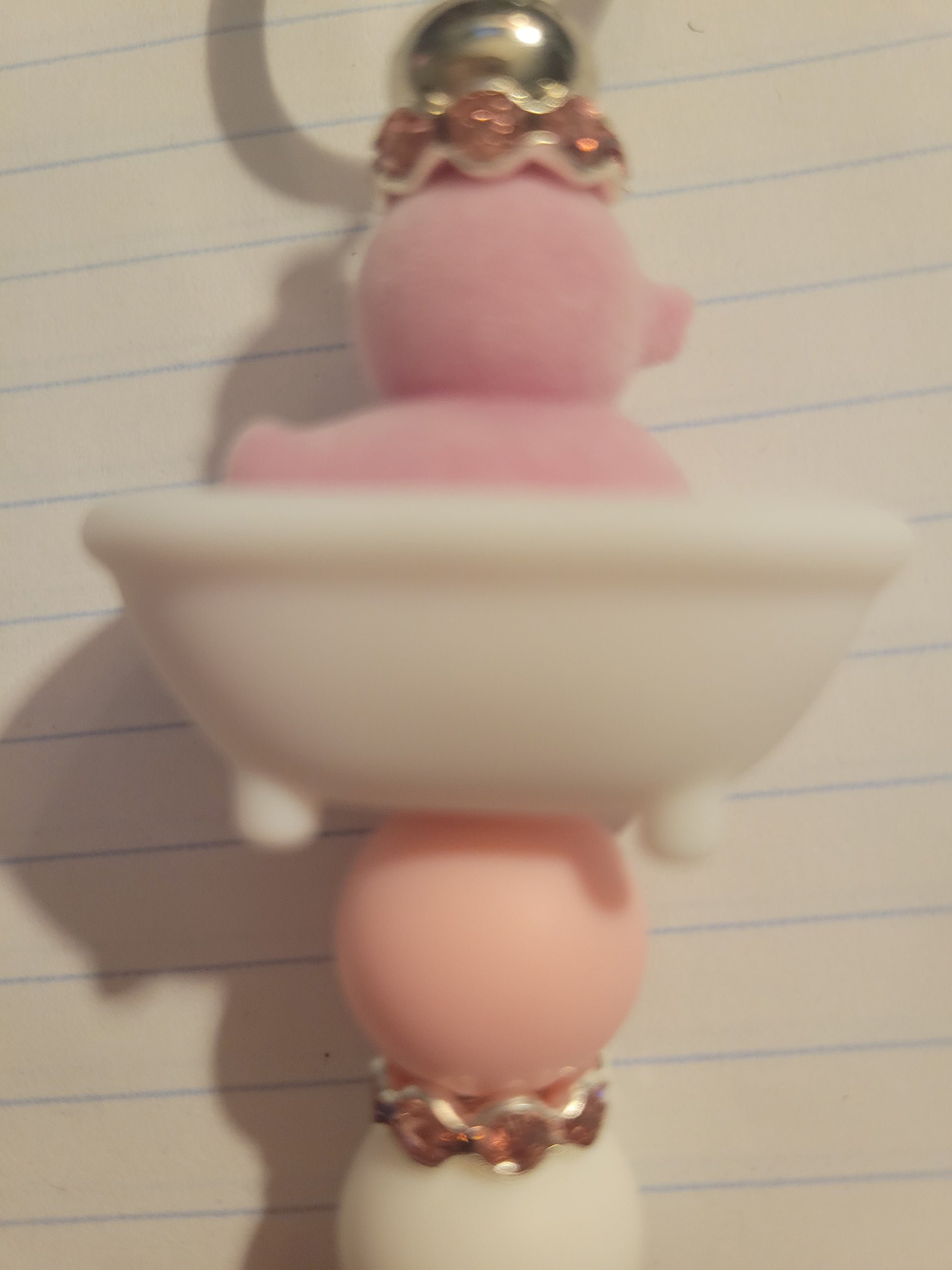 This Pink Duck Stick Keychain has a pink duck in a white bathtub. You can secure keyscon key ring or clip them to another key ring.